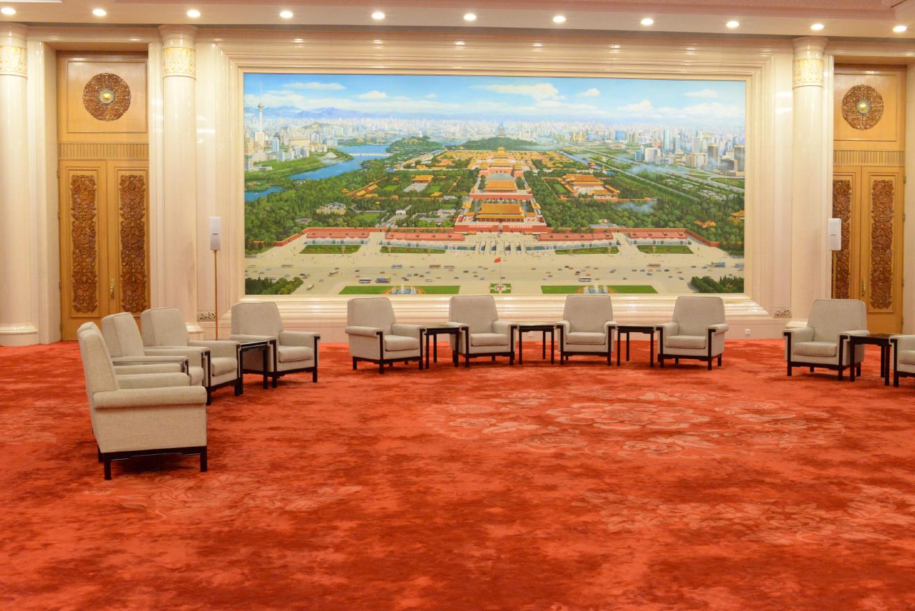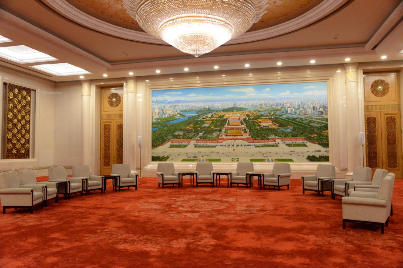 北京庁 | 人民大会堂を大解剖 30 Jun, 2017 世界 ! 北京の間、偉い人たちが会談しだしそうな席配置になっています。 ! レンズを換えて撮ると少しよく見えます。 ! ! シャンデリアはこんな感じ。きれいに撮れました。 ! 上海の間と同じく、階段を上がったところにあります。いいところに陣取っています。 ! #中国 #人民大会堂 #北京