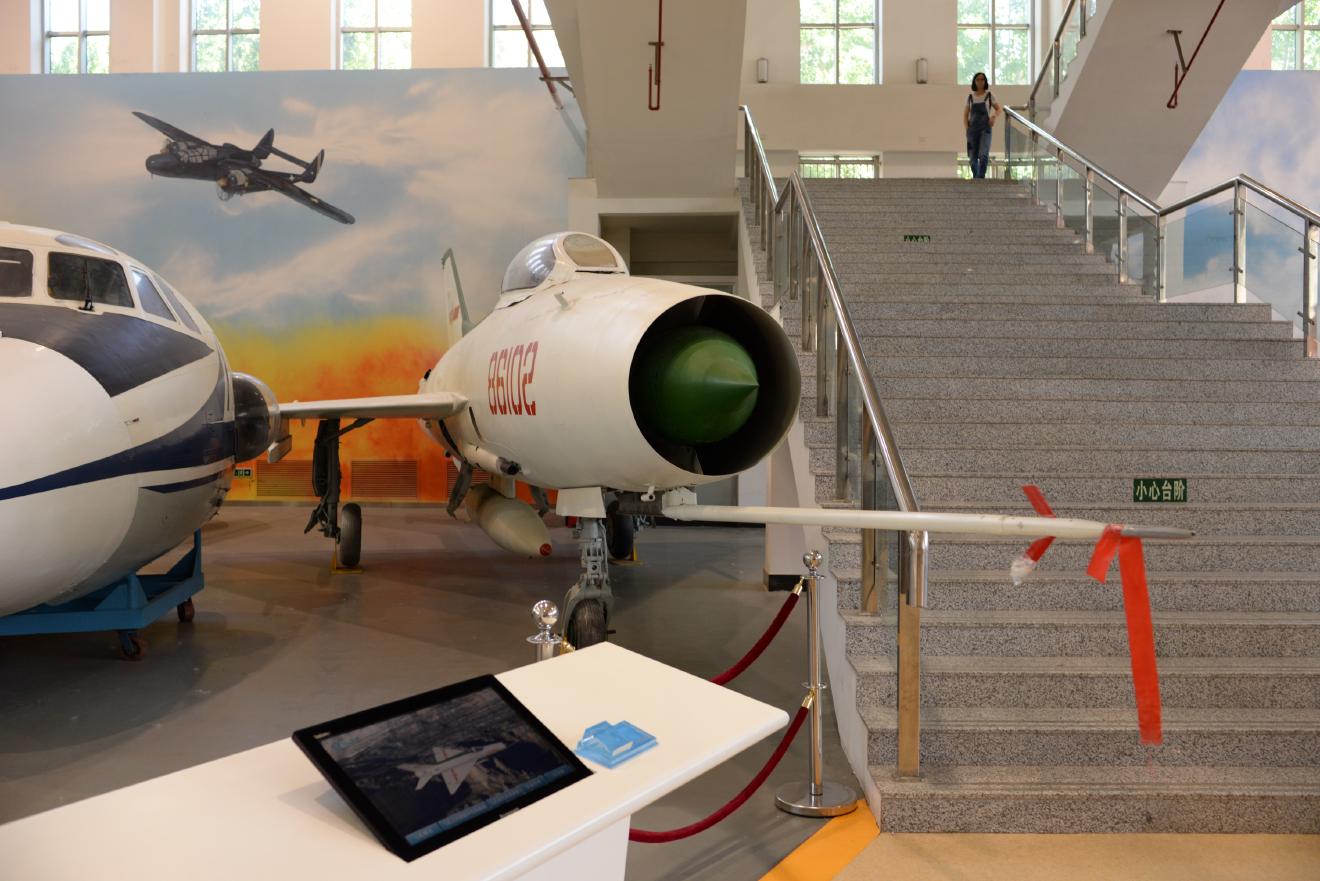 ソ連のミグ21戦闘機。1955年に初飛行しました。まだ多くの国で現役です。ぶつからないように赤いテープが取り付けてあります。