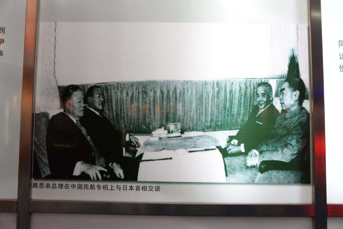 周恩来総理が中国民航の機上で田中角栄総理とお話をされているようす。